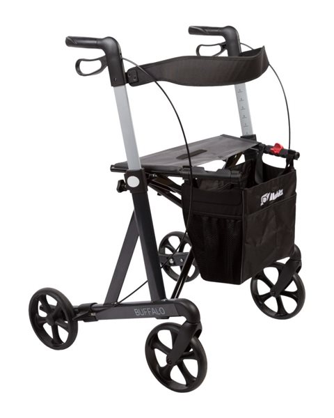 The Mobilex lightweight rollator Buffalo HD has an aluminium frame that can be folded sidewards witch in folded state reduces the required space to a minimum. Its structure is reinforced with additional elements. The rollator is easy to open and fold and suitable for use both outdoors and indoors. The comfortable seat is made of tear resistant nylon. The push handles can easily be adjusted in height without use of tools.